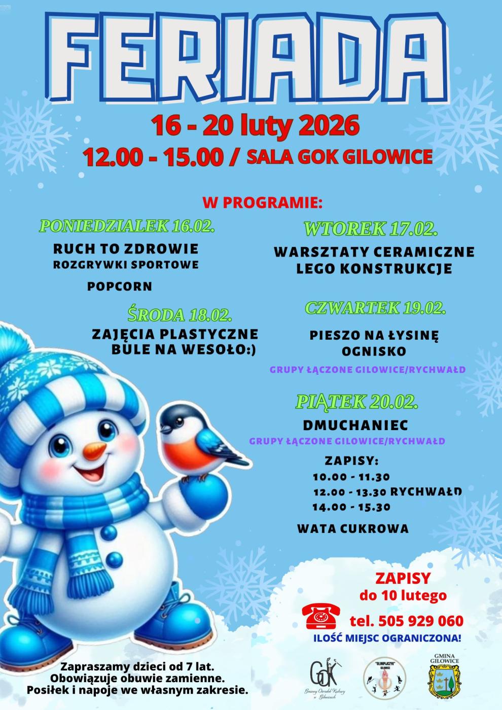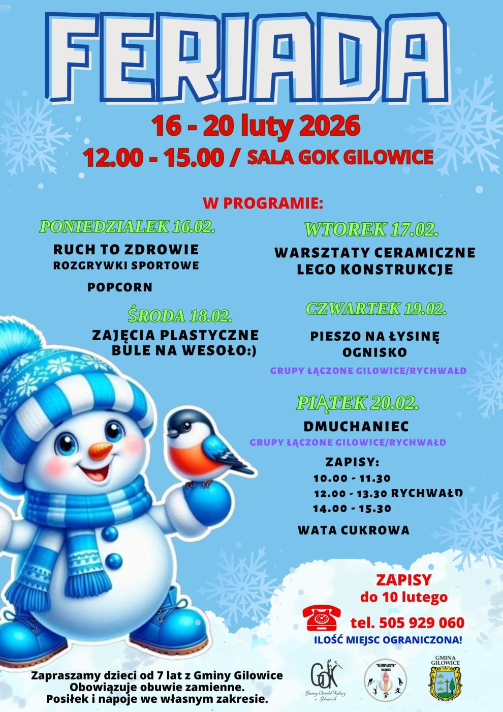 Zapraszamy do zapisów na zajęcia dla dzieci podczas ferii organizowane przez Gminę Gilowice, Gminny Ośrodek Kultury w Gilowicach oraz Parafialny Klub Sportowy "Olimpijczyk".