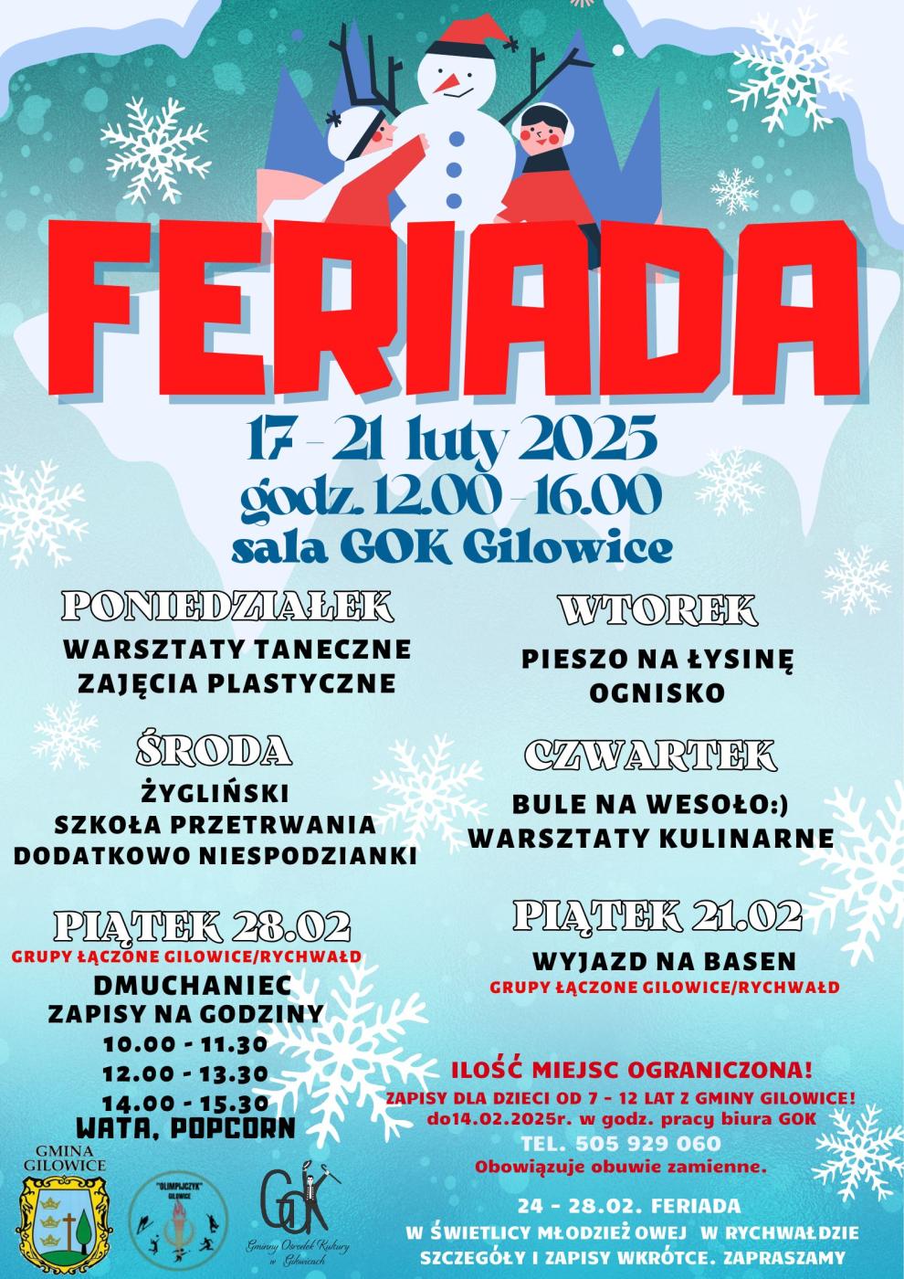 05.02.2025 FERIADA - zapisy na zajęcie Zapraszamy do zapoznania się z ofertą nieodpłatnych zajęć podczas ferii zimowych dla dzieci z gminy Gilowice. Szczegóły na plakacie. Galeria zdjęć Kliknij w zdjęcie, aby je powiększyć. Wróć do listy Poprzedni Następny Drukuj