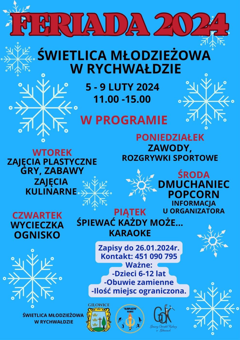 16.01.2024 Ferie zimowe Rychwałd - zapisy Zapraszamy dzieci z Rychwałdu na FERIADĘ. Zapisy w godzinach pracy świetlicy (12.00 - 16.00). Szczegóły na plakacie. Galeria zdjęć Kliknij w zdjęcie, aby je powiększyć. Wróć do listy Poprzedni Następny Drukuj