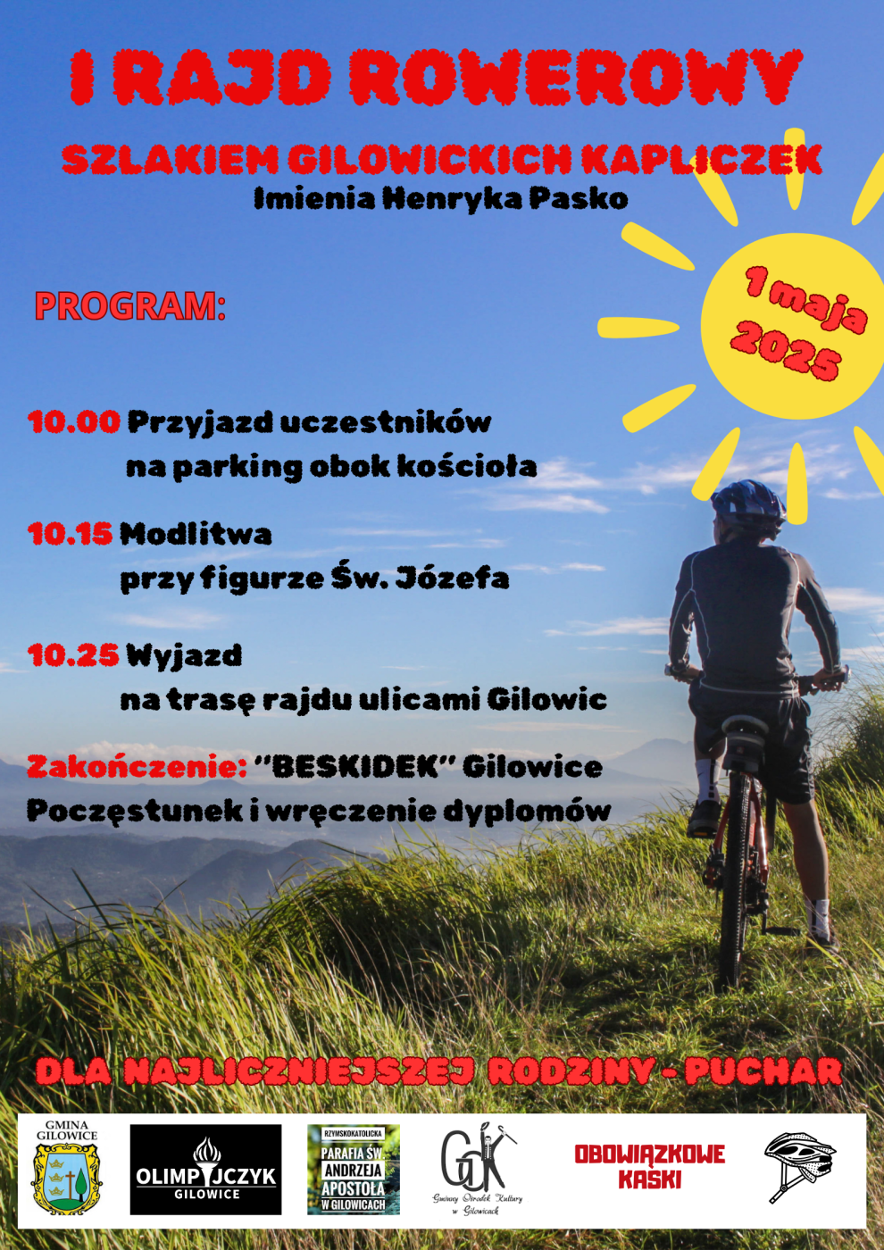 24.04.2025 I RAJD ROWEROWY SZLAKIEM GILOWICKICH KAPLICZEK IM. HENRYKA PASKO Zapraszamy do udziału w rajdzie rowerowym. Szczegóły na plakacie. Galeria zdjęć Kliknij w zdjęcie, aby je powiększyć. Wróć do listy Poprzedni Następny Drukuj