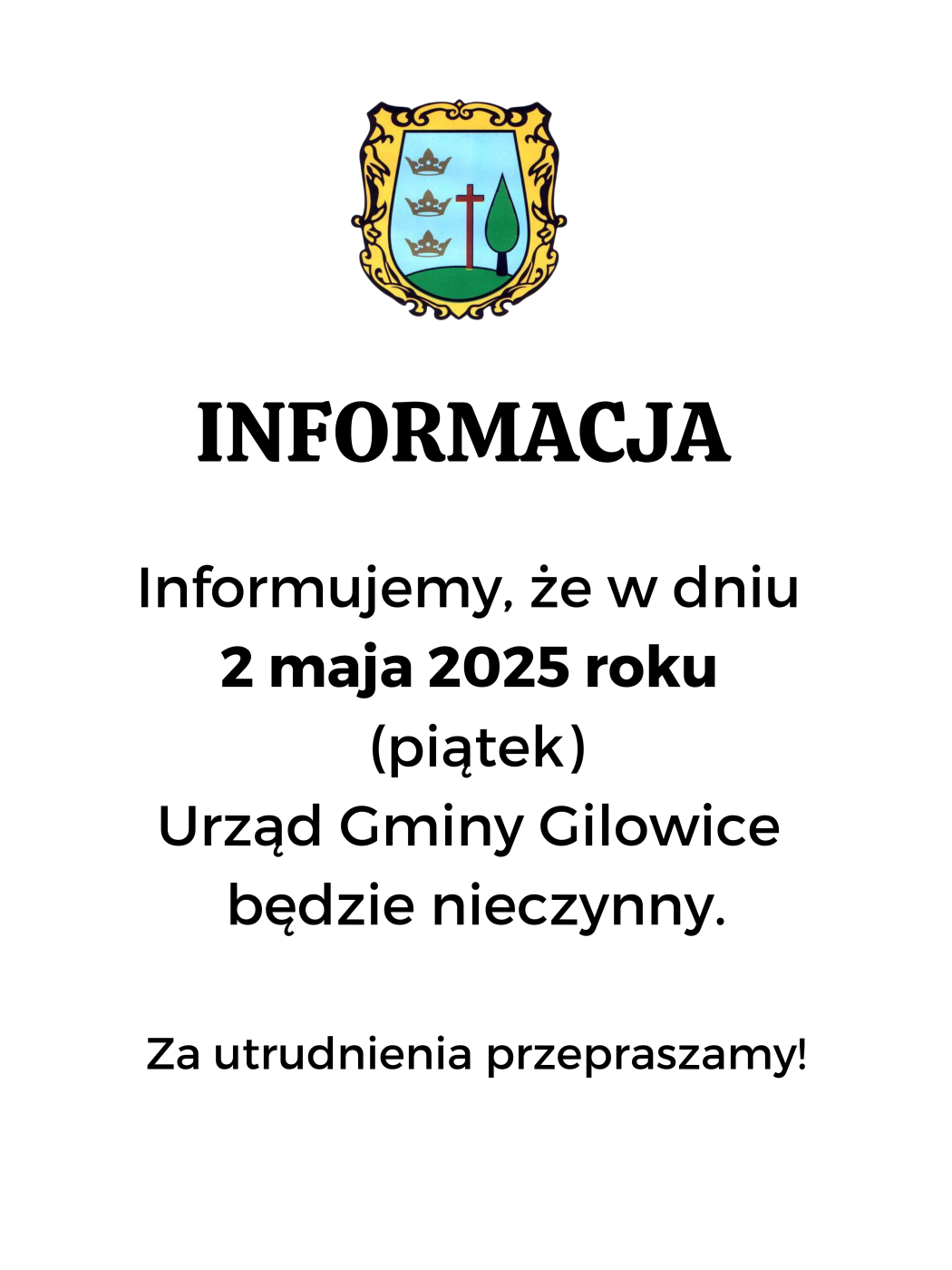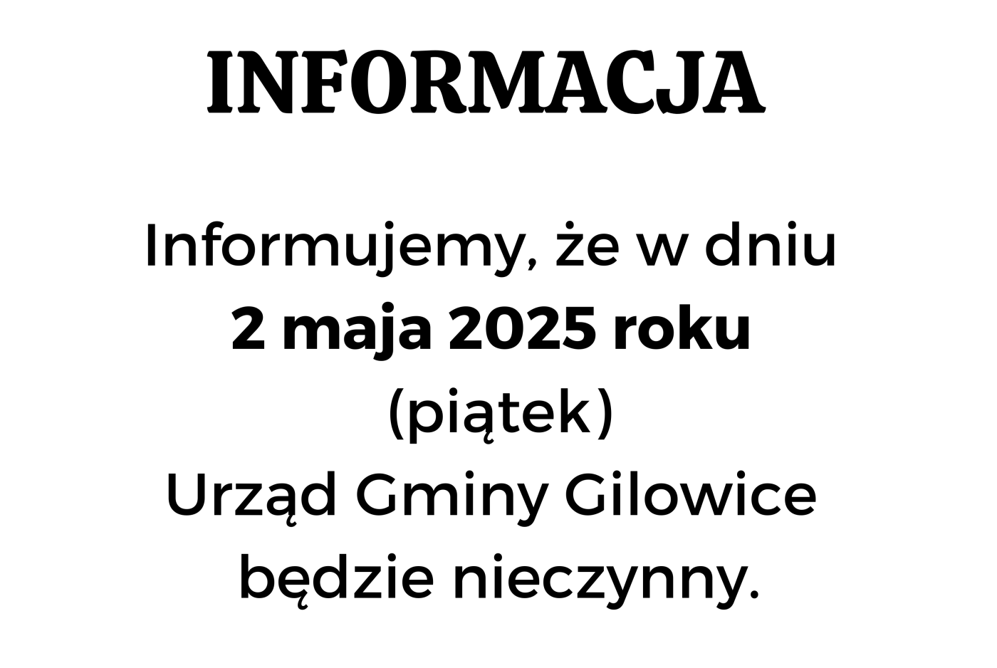 29.04.2025 INFORMACJA - 2 maja 2025 r. Urząd Gminy Gilowice będzie nieczynny. Galeria zdjęć Kliknij w zdjęcie, aby je powiększyć. Wróć do listy Poprzedni Następny Drukuj