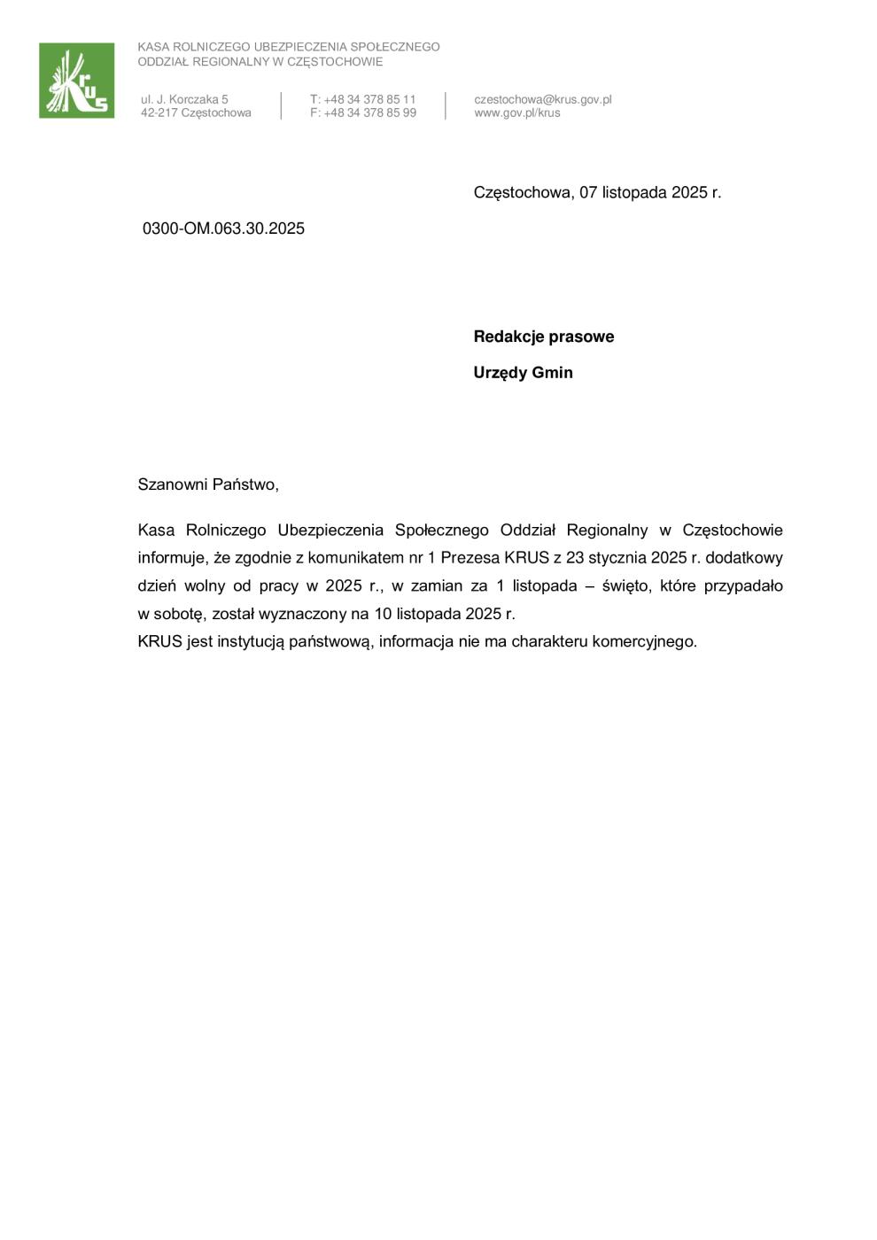 07.11.2025 INFORMACJA KRUS Galeria zdjęć Kliknij w zdjęcie, aby je powiększyć. Do pobrania pismo przewodnie- dzień wolny Wróć do listy Poprzedni Następny Drukuj
