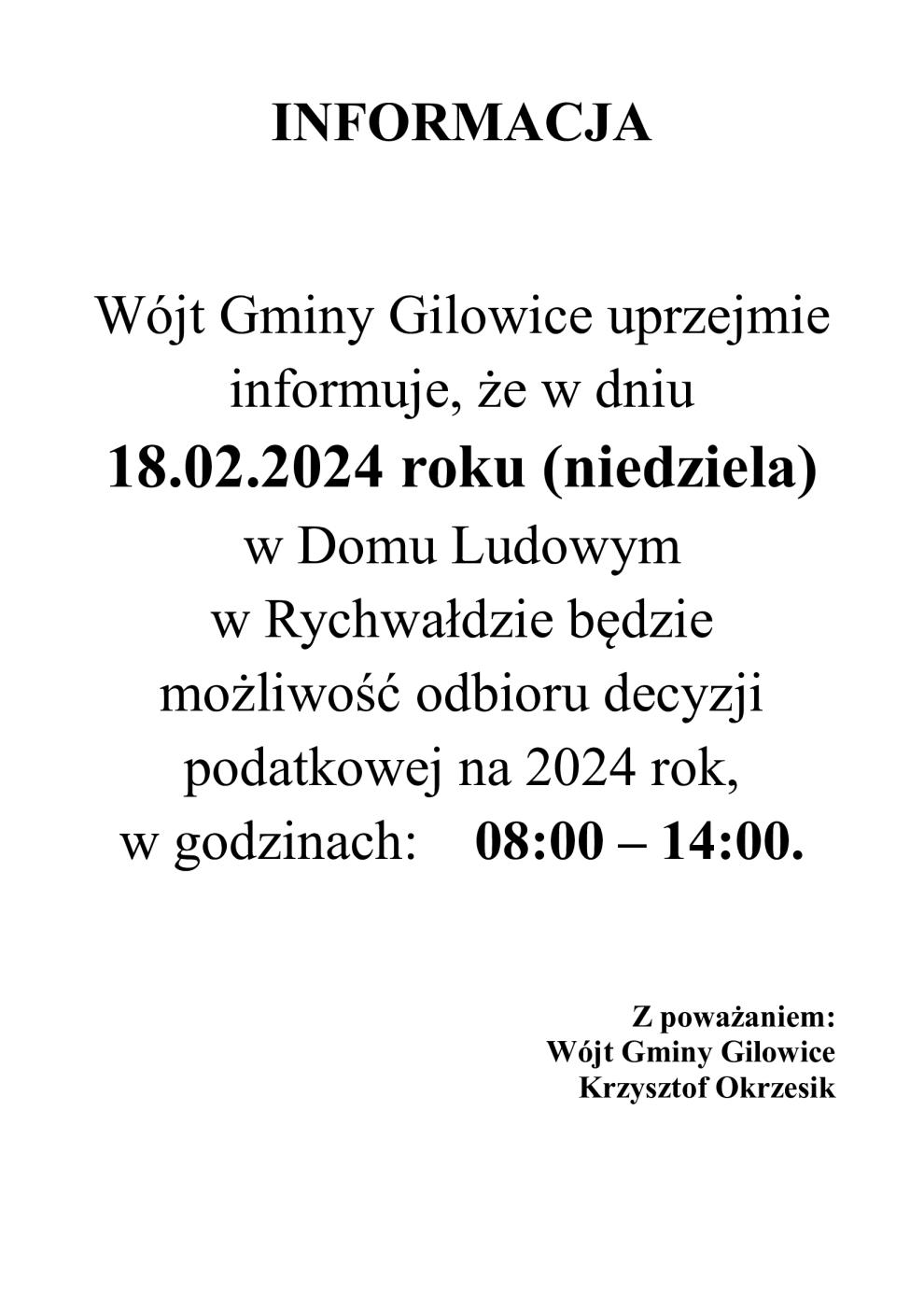 15.02.2024 INFORMACJA Wójt Gminy Gilowice uprzejmie informuje, że w dniu 18.02.2024 roku (niedziela) w Domu Ludowym w Rychwałdzie będzie możliwość odbioru decyzji podatkowej na 2024 rok, w godzinach: 08:00 – 14:00. Z poważaniem: Wójt Gminy Gilowice Krzysztof Okrzesik Galeria zdjęć Kliknij w zdjęcie, aby je powiększyć. Wróć do listy Poprzedni Następny Drukuj
