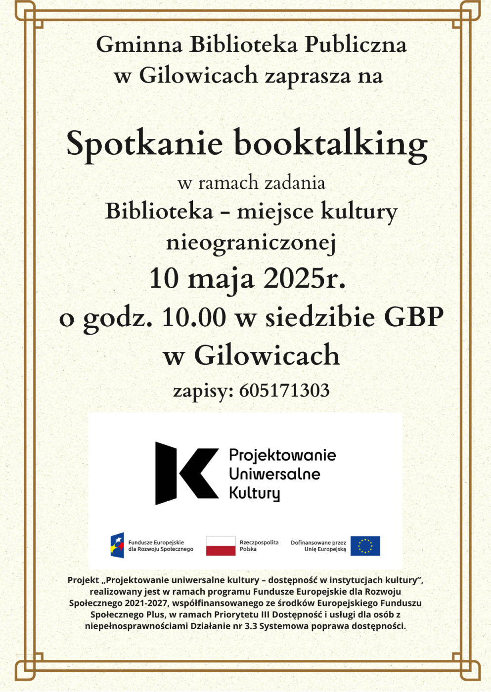"Biblioteka - miejsce kultury nieograniczonej": Projekt “Projektowanie Uniwersalne Kultury – Dostępność w Instytucjach Kultury” jest finansowany ze środków Unii Europejskiej w ramach działania 3.3 “Systemowa Poprawa Dostępności” Priorytetu III “Dostępność i Usługi dla Osób z Niepełnosprawnościami” Programu Fundusze Europejskie dla Rozwoju Społecznego 2021-2027.