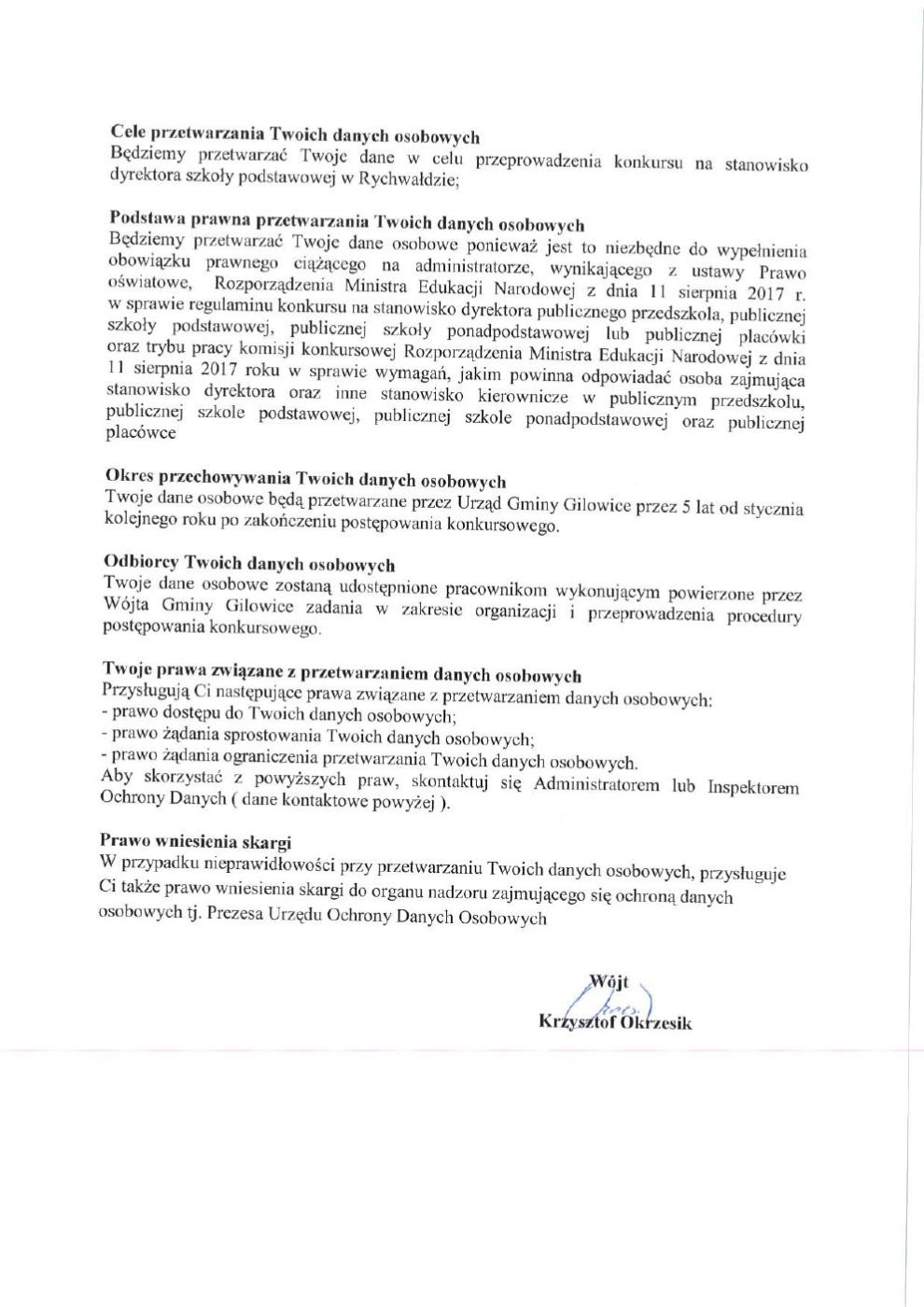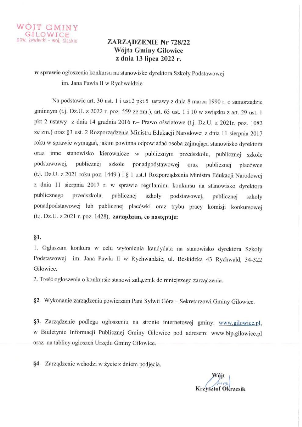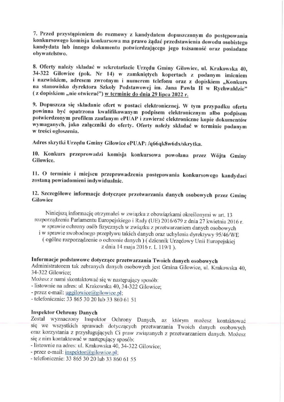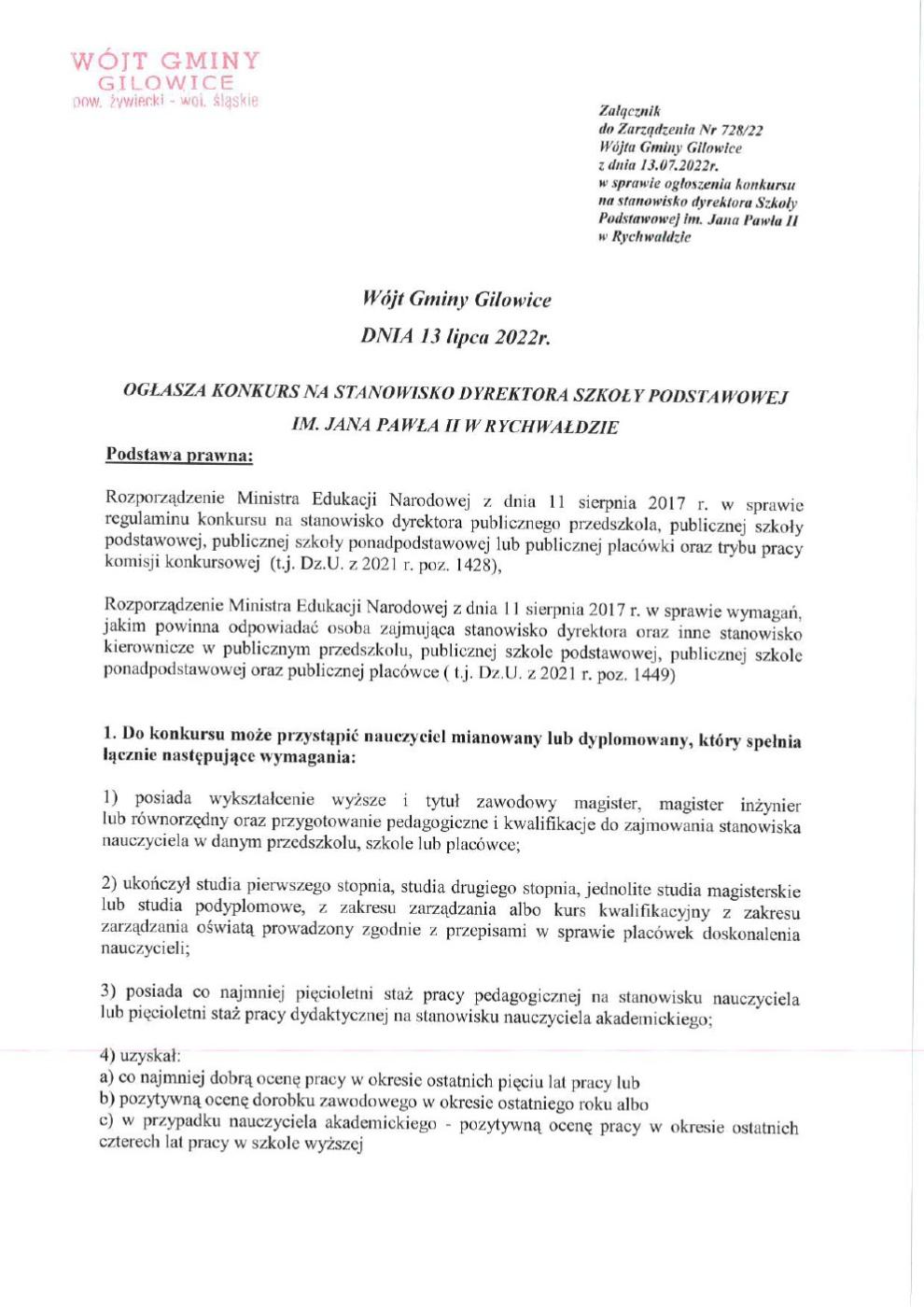 13.07.2022 KONKURS na dyrektora szkoły w Rychwałdzie Wójt Gminy Gilowice ogłasza konkurs na stanowisko dyrektora Szkoły Podstawowej im. Jana Pawła II w Rychwałdzie. Galeria zdjęć Kliknij w zdjęcie, aby je powiększyć. Wróć do listy Poprzedni Następny Drukuj