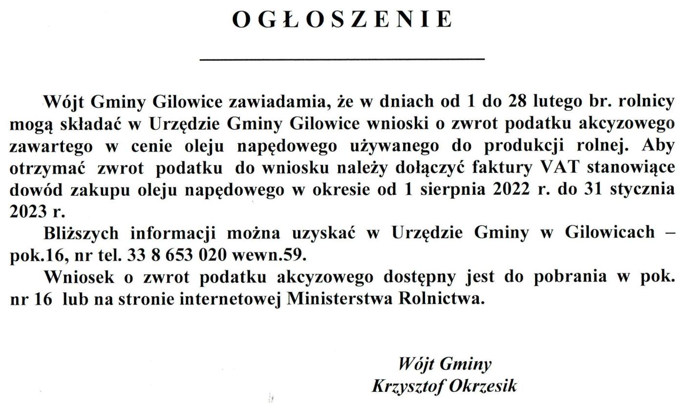 07.02.2023 OGŁOSZENIE O ZWROT PODATKU AKCYZOWEGO Galeria zdjęć Kliknij w zdjęcie, aby je powiększyć. Wróć do listy Poprzedni Następny Drukuj