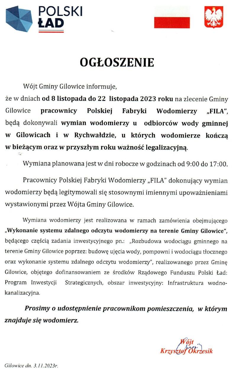 że w dniach od 8 listopada do 22 listopada 2023 roku na zlecenie Gminy Gilowice pracownicy Polskiej Fabryki Wodomierzy „FILA”, będą dokonywali wymian wodomierzy u odbiorców wody gminnej w Gilowicach i w Rychwałdzie, u których wodomierze kończą w bieżącym oraz w przyszłym roku ważność legalizacyjną.