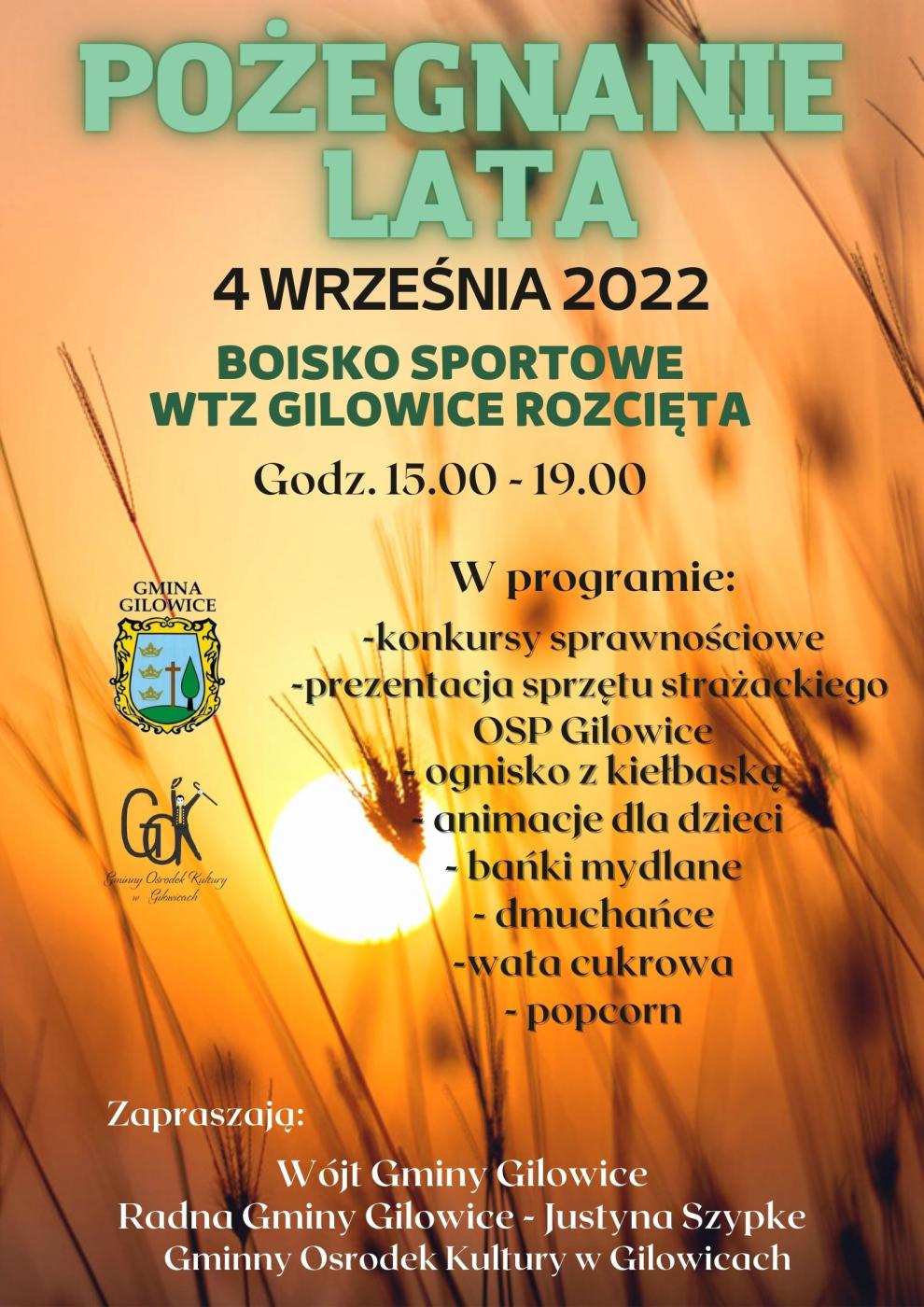 23.08.2022 Pożegnanie lata 2022 W razie niepogody impreza odbędzie się na sali gimnastycznej Zespołu Szkół w Gilowicach. Galeria zdjęć Kliknij w zdjęcie, aby je powiększyć. Wróć do listy Poprzedni Następny Drukuj