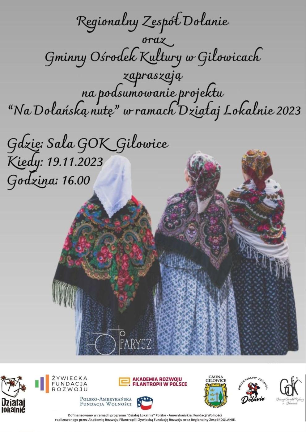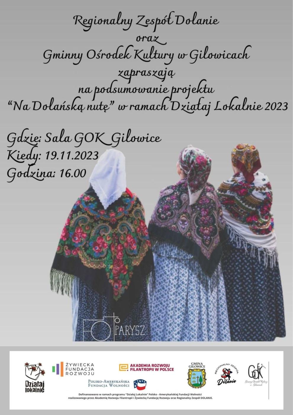 31.10.2023 Regionalny Zespół DOLANIE oraz Gminny Ośrodek Kultury w Gilowicach zapraszają na podsumowanie projektu "NA DOLAŃSKĄ NUTĘ" Galeria zdjęć Kliknij w zdjęcie, aby je powiększyć. Wróć do listy Poprzedni Następny Drukuj