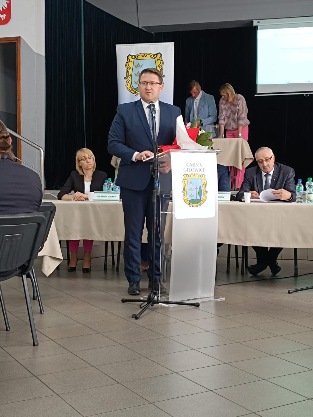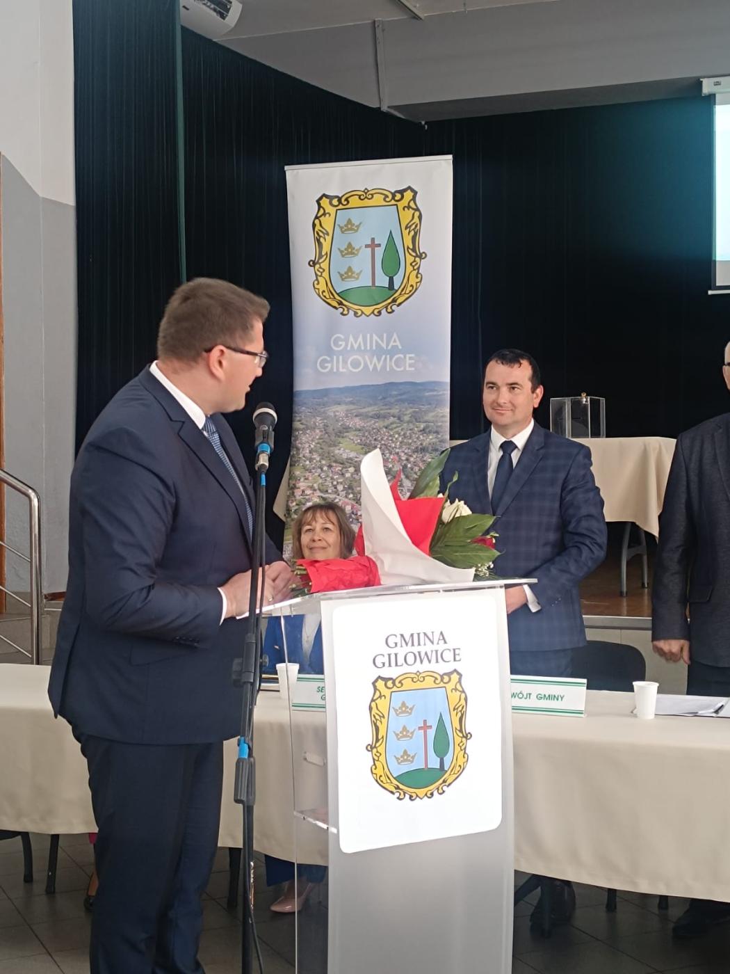 Następnie odbyło się zaprzysiężenie Wójta Gminy Gilowice – Krzysztofa Okrzesika. Po odebraniu zaświadczenia o wyborze na Wójta Gminy z rąk Przewodniczącego Gminnej Komisji Wyborczej, Wójt w obecności zaproszonych gości złożył ślubowanie.