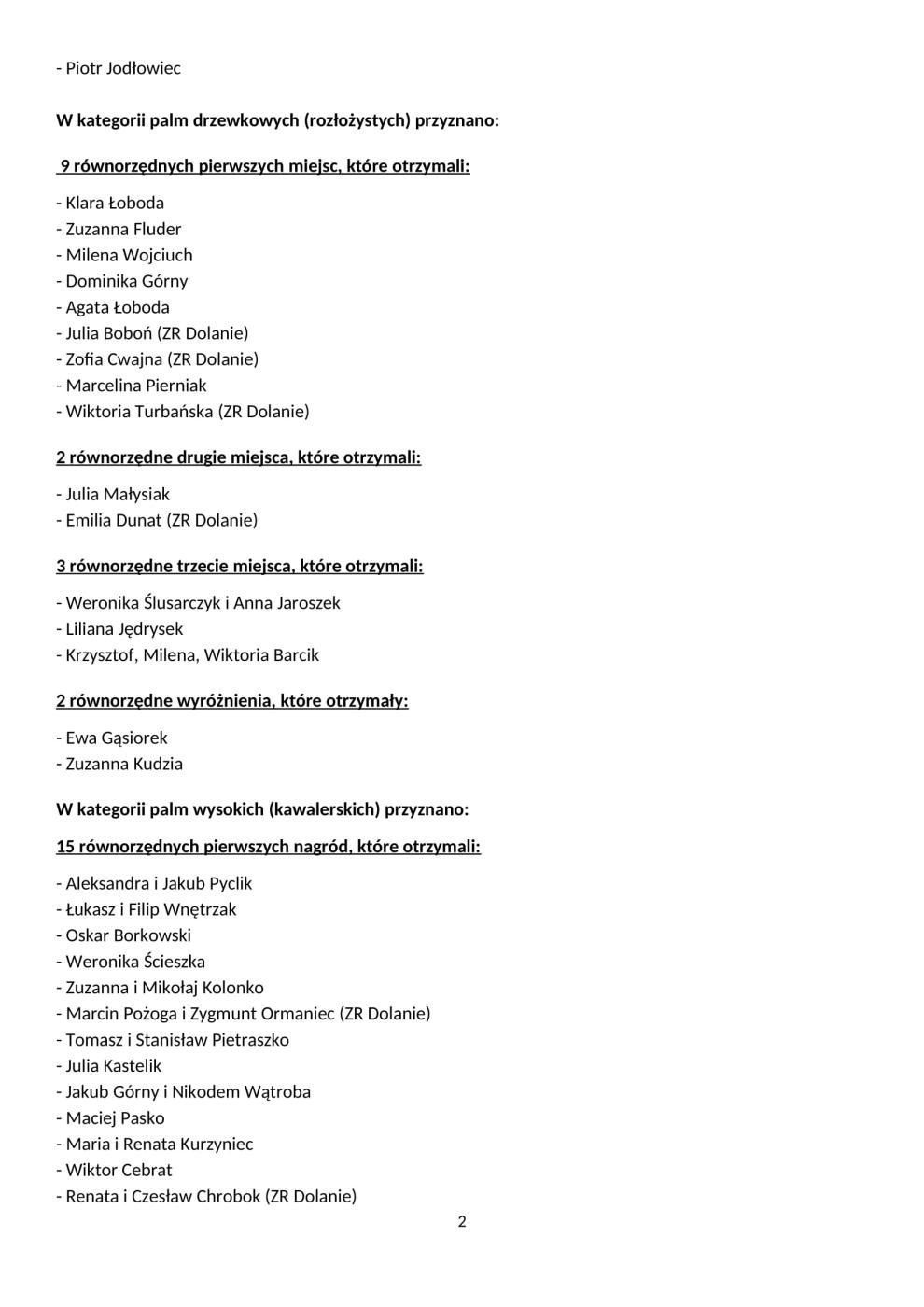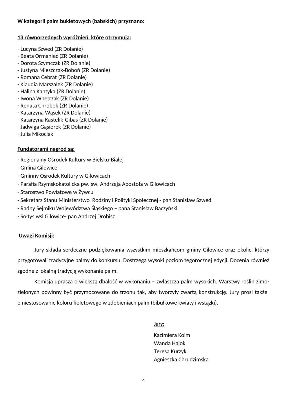 Jury składa serdeczne podziękowania wszystkim mieszkańcom gminy Gilowice oraz okolic, którzy przygotowali tradycyjne palmy do konkursu. Dostrzega wysoki poziom tegorocznej edycji. Docenia również zgodne z lokalną tradycją wykonanie palm.