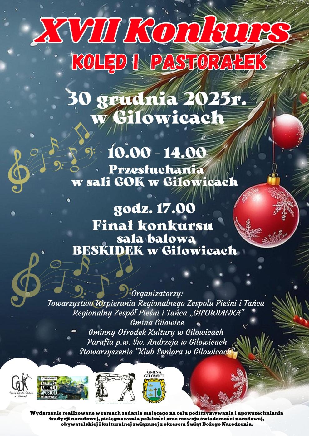 Regulamin konkursu, karta zgłoszenia oraz niezbędne zgody rodziców/opiekunów do pobrania na stronie https://gilowice.naszgok.pl/n,xvii-konkurs-koled-i-pastoralek-w-gilowicach