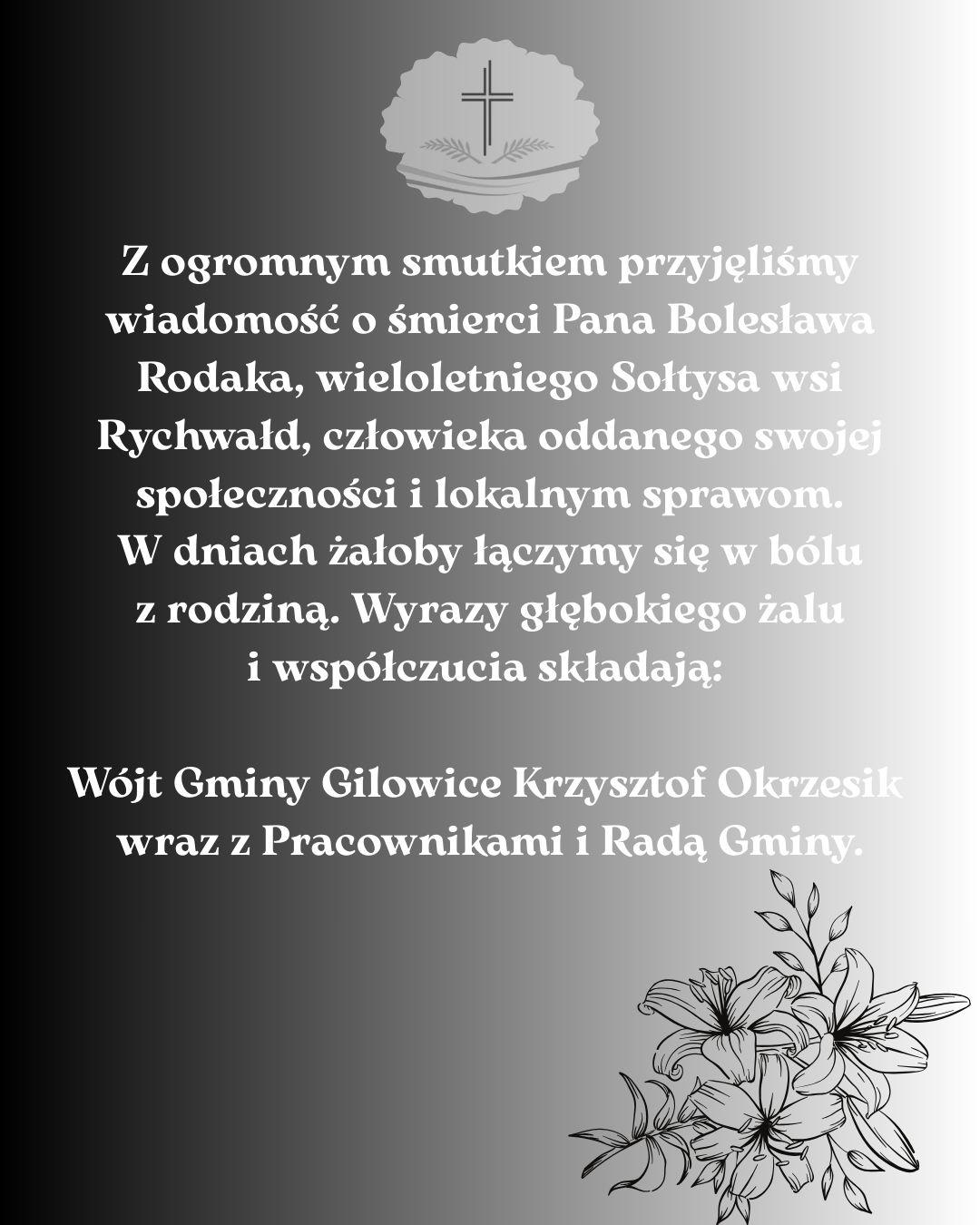27.11.2025 Z ogromnym smutkiem przyjęliśmy wiadomość o śmierci Pana Bolesława Rodaka, wieloletniego Sołtysa wsi Rychwałd. W dniach żałoby łączymy się w bólu z rodziną. Galeria zdjęć Kliknij w zdjęcie, aby je powiększyć. Wróć do listy Poprzedni Następny Drukuj