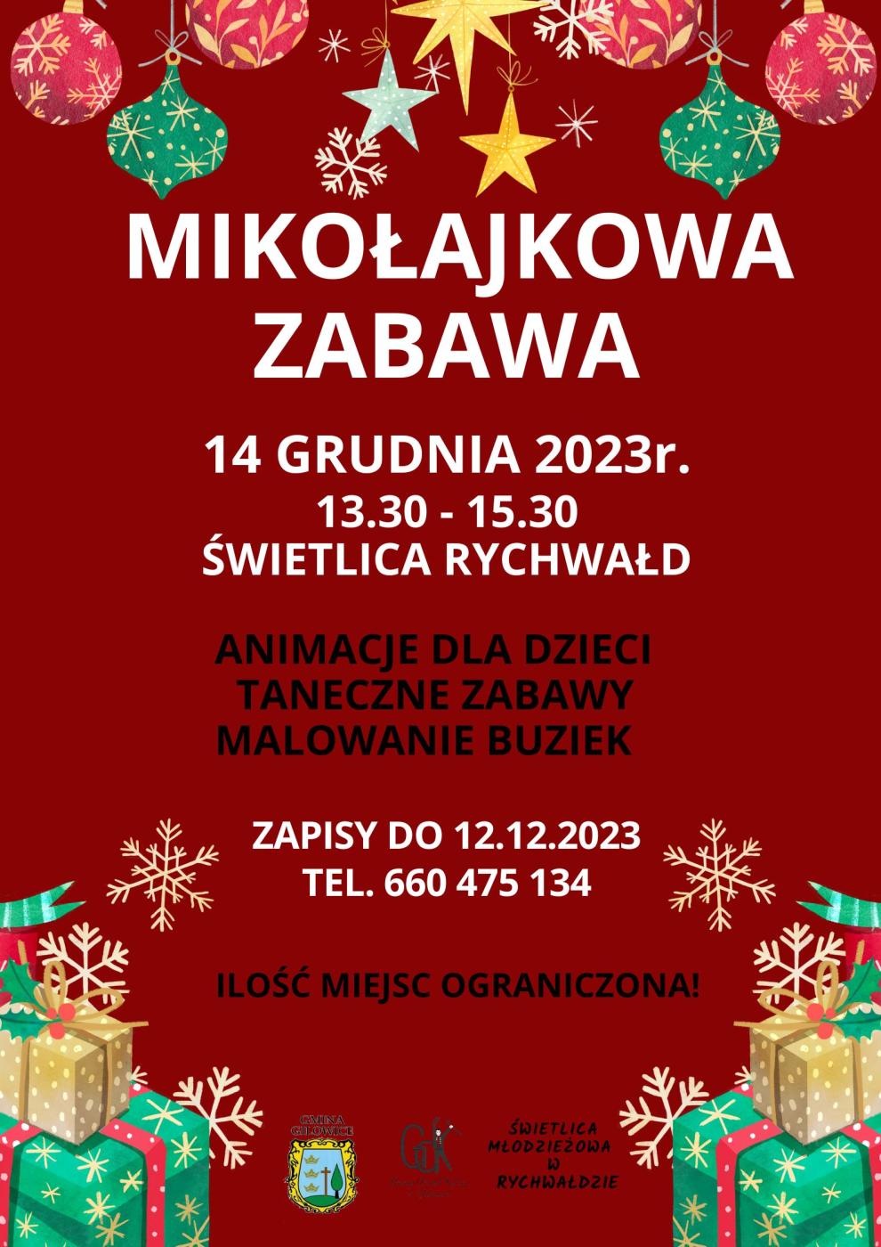 06.12.2023 ZABAWA MIKOŁAJKOWA W RYCHWAŁDZIE - ZAPISY Wójt Gminy Gilowice oraz Gminny Ośrodek Kultury w Gilowicach zapraszają na ZABAWĘ MIKOŁAJKOWĄ w Świetlicy Młodzieżowej w Rychwałdzie. Obowiązuje akcent mikołajkowy oraz obuwie zamienne. Szczegóły na plakacie. Galeria zdjęć Kliknij w zdjęcie, aby je powiększyć. Wróć do listy Poprzedni Następny Drukuj