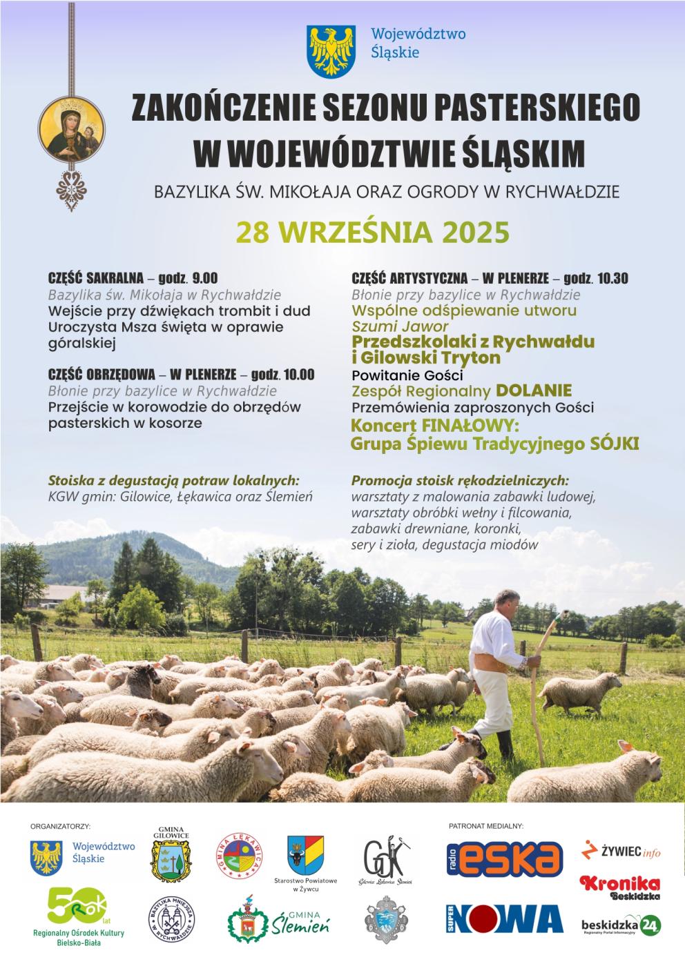 15.09.2025 ZAKOŃCZENIE SEZONU PASTERSKIEGO W WOJEWÓDZTWIE ŚLĄSKIM Organizatorzy wydarzenia zapraszają do uroczystość Zakończenia Sezonu Pasterskiego w Województwie Śląskim Szczegóły poniżej Galeria zdjęć Kliknij w zdjęcie, aby je powiększyć. Wróć do listy Poprzedni Następny Drukuj