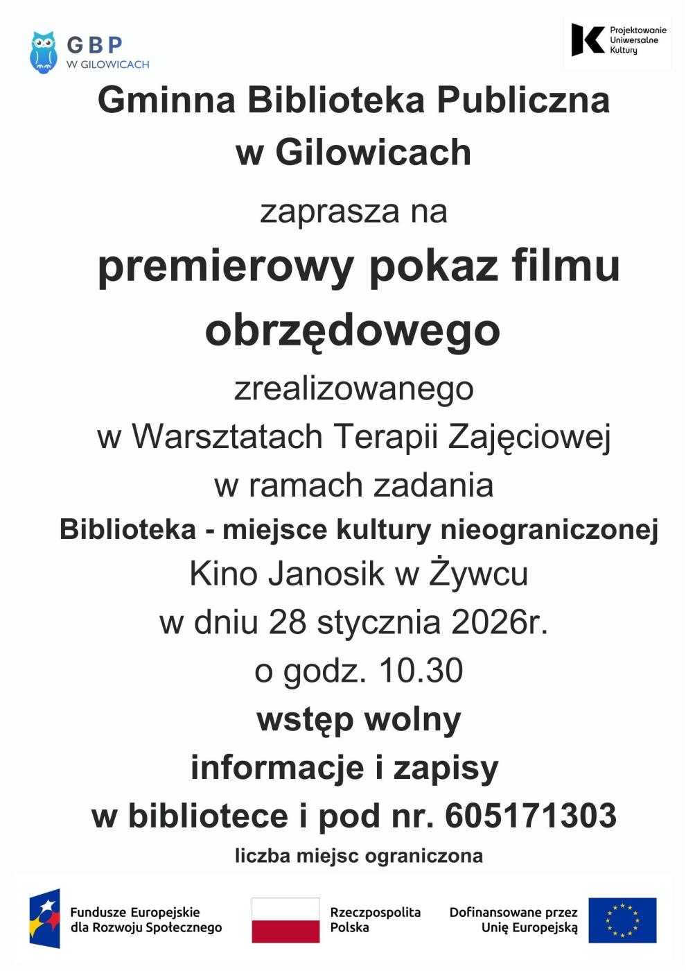 Gminna Biblioteka Publiczna w Gilowicach realizuje zadanie Biblioteka – miejsce kultury nieograniczonej w ramach projektu „Projektowanie uniwersalne kultury – dostępność w instytucjach kultury”, realizowany jest w ramach programu Fundusze Europejskie dla Rozwoju Społecznego 2021-2027, współfinansowanego ze środków Europejskiego Funduszu Społecznego Plus, w ramach Priorytetu III Dostępność i usługi dla osób z niepełnosprawnościami Działanie nr 3.3 Systemowa poprawa dostępności.