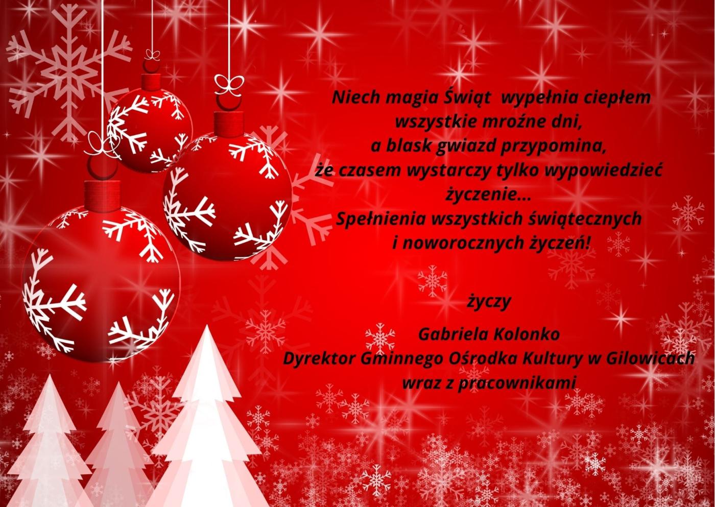 21.12.2023 ŻYCZENIA Gminny Ośrodek Kultury w Gilowicach Galeria zdjęć Kliknij w zdjęcie, aby je powiększyć. Wróć do listy Poprzedni Następny Drukuj