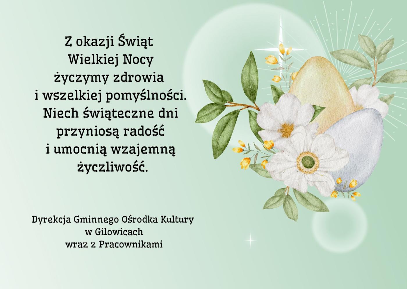 04.04.2023 Życzenia Wielkanocne Gminnego Ośrodka Kultury w Gilowicach Galeria zdjęć Kliknij w zdjęcie, aby je powiększyć. Wróć do listy Poprzedni Następny Drukuj